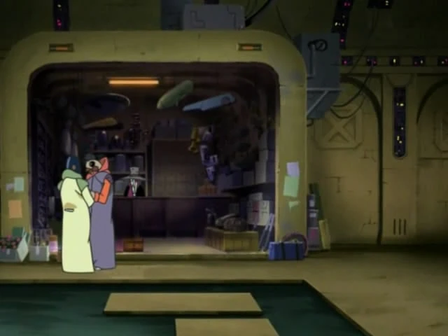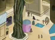 The Alien Street appears for the first time when Natsumi suddenly falls sick with a high fever. Giroro goes after a liver of Space Cerberus, which was said to be able to cure all sickness. The location is mostly empty with dark corridors and stores, few aliens standing around, and water filling a large part of the structure.[1]