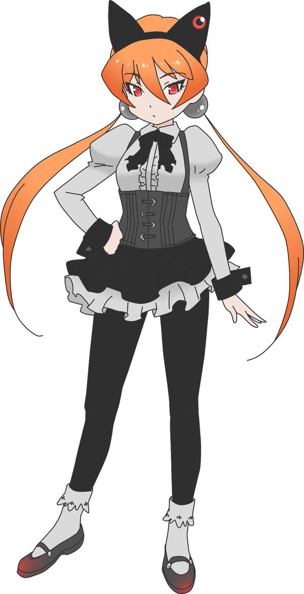 Alisa is humanoid. She has scarlet eyes, long yellow-orange hair put in the ponytail/pigtails in the back held in place by two sky blue glass-like orbs. She usually wears a long sleeved black shirt, complete with white cuffs and a light gray blouse over the shirt with a small black ribbon, a small dark gray skirt, black tights, pointy white socks and black mary janes. Alisa's father usually rests on Alisa's head in the form of black cat ears.