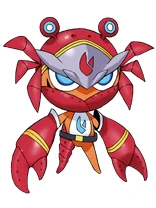 Chokiki is a burnt orange color. His cap is in the shape of a red crab with blue eyes, it is placed over his gray helmet which has two spikes on each side by a yellow elastic band. His usually white face markings are black and most of his bottom half is covered by a red metal mask. He has huge crab claw gloves with yellow elastic bands the gloves are also held by gray edges. He wears one red mechanical crab leg and a black belt with a gold buckle. His sign is a red crab claw on his helmet and a cyan blue crab claw on his stomach.