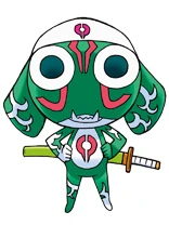 Edodo is a jade green Keronian. He has round eyes that resemble Keroro's except the black of his eye is a dark teal, a white cap with green flaps and a large katana. He has white markings on the flaps of his hat, his arms and his legs. He has red markings on his forehead and under his eyes. His sign is a split red hook shape.