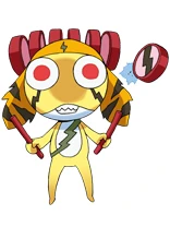 He is a yellow Keronian with black lightning-shaped stripes. His eye color is red. His appearance is based on the Japanese Thunder God, Raijin, with drumsticks and the lightning emblem. There are also drums surrounding him.