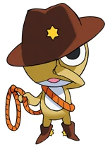 He is a tan cowboy keronian with a brown hat and a pair of cowboy boots. He mainly wears a rope around his belly. His symbol is a texan star. His boots have the star on them, too.