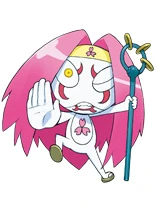 Kabubu is a keronian with pink hair and a light yellow head band. He wears sandals and carries a blue staff with 3 gold rings on it. He has pink markings over his eyes and mouth with an eye color of yellow. His symbol is a pink flower with three petals.