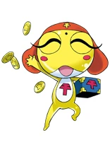 She is a yellow adult Keronian. She wears an orange cap and red cheeks. Her eyes are seen closed in her official artwork, with her eyelashes seen. Her symbol is red colored and resembles the Yen sign.