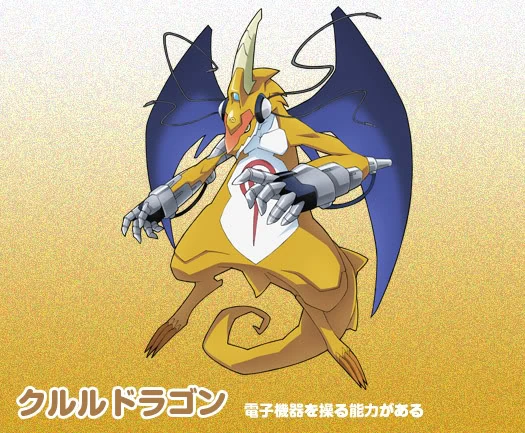 During the fourth movie, Shion captured Kururu and turned him into a dragon. In this form, he is a yellow dragon with metallic blue wings. He loses the glasses in this form, revealing yellow green eyes. On his chest is a warped spiral symbol, and his headset has cords protruding from them, allowing him to utilize electrokinesis.