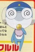 Kururu is a yellow adult Keronian with a small yellow spiral symbol on his orange cap and a red spiral on his belly. His headphones are a multipurpose gadget and have been seen performing a multitude of tasks. He wears white glasses with spirals on them. His eyes have never been seen, but it's likely that his eyes are green, as when he's in his dragon form and when he's in various Pekoponian costumes, his eyes are an olive-green. But once his eyes revealed to be dark as seen in episode 240th. When his glasses are taken off his eyes resembles a kissyface emoticon, or a 3. [2]