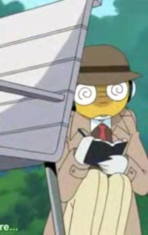 Keroro gives the Keroro Platoon an order to find the wanted criminal #303, Kururu dresses up as cop wearing a brown hat and matching trench coat.