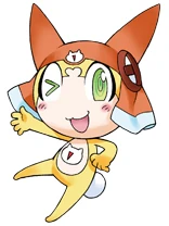 Monana is a cat based Keronian that has yellow skin, a heart pattern around her tadpole markings, she has a round tail, and green eyes. She wears an orange cap with long cat ears and orange flaps with blue outlines with a large brown button on her left ear. Her symbol is a white cat's head with an upside down red triangle, mimicking an excited cat.