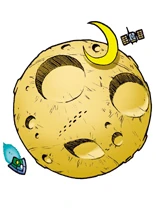 Munn is a large pale yellow ball shape. He has two large craters for eyes and another large one for his mouth. He also has other smaller ones spread across his face. His sign is a yellow crescent moon. He also has a satellite orbiting around him and a small space ship passing by.