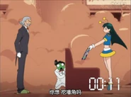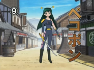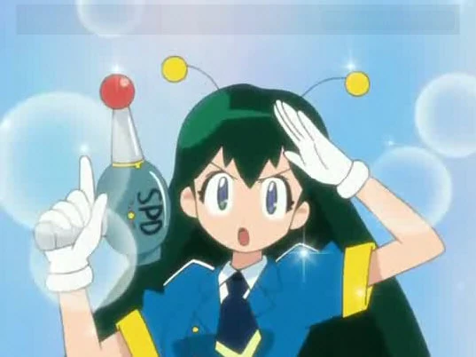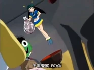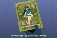 Poyon appears again in episode 60, when Keroro goes through space and time. Poyon follows Keroro and asks the guy in the blue car to stop. She than asks Keroro to go with her to the Police Station to do a report as he illegally went through time and went over the speed limit. When Natsumi Hinata asks if she can still go, Poyon says yes. She is last seen interacting with the Narrator when he asks how she is that small, Poyon simply says that she is a Space Policewoman.