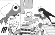 Poyon is first seen in episode 11, when her spaceship breaks down, Poyon is than left to fix it. However, at the end of the episode Poyon finally made it to Pekopon to arrest R Gray, 3M and The Camera Man, Mr. G for impersonating Famous Stars, she says that she has been tracking them down for a long time, and is glad that she finally was able to catch them. When Keroro asks what happened to the real stars, she says that they always make their journeys, making Keroro very happy. Poyon is later seen carrying the Fake's spaceship off of Giroro.