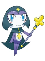 She's a dark purple tadpole with her tail not seen (possibly hidden) her emblem is a yellow cross. She wears a dark blue almost black cape, and hat that makes her resemble a nun, her cape has two yellow buttons on it and holding a long scepter and the tip match to her symbol. Her eyes are light blue, and much more anime girl shaped then the other female keronian's.